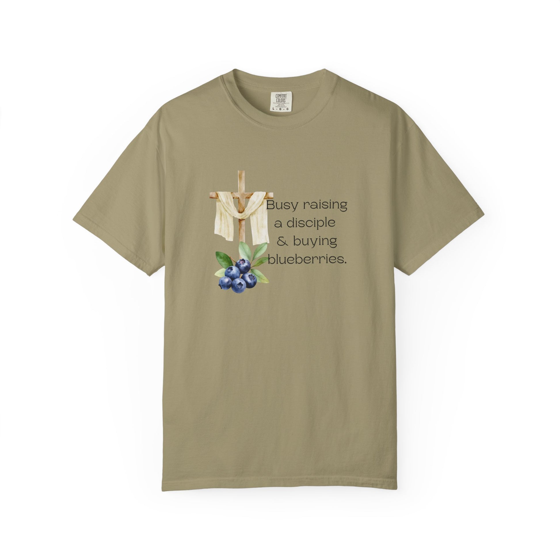 A comfortable and stylish unisex garment-dyed t-shirt featuring a unique design that reads 'Busy raising a disciple and buying blueberries'. This shirt glorifies God, perfect for everyday wear or casual outings. Ideal for parents or caregivers who are passionate about raising children to know Jesus. Relevant for Mother's Day, Father's Day, or just as a thoughtful gift for someone special.