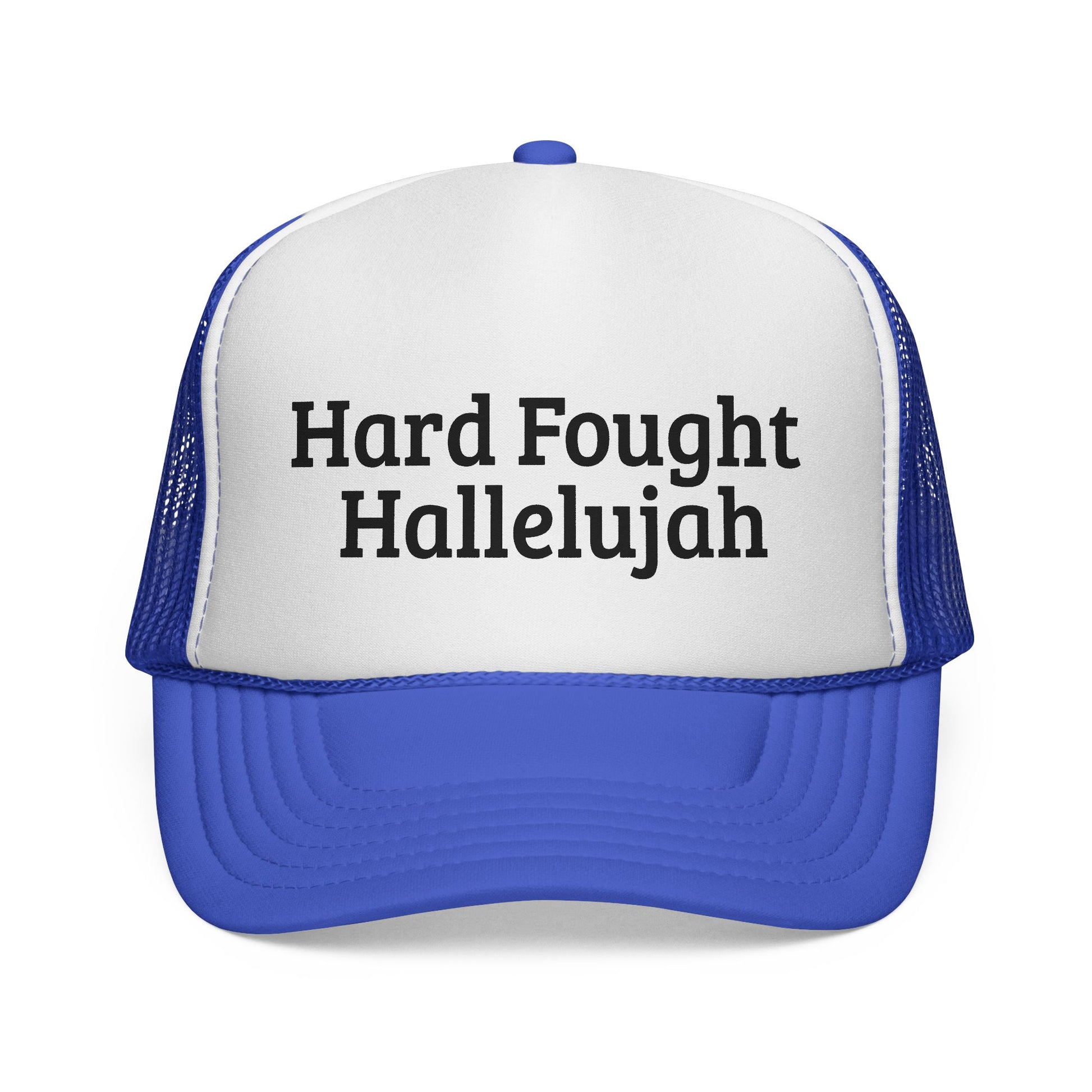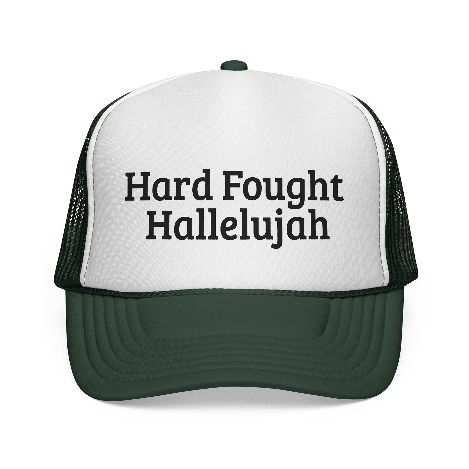 This Hard Fought Hallelujah Trucker Cap is a perfect inspirational accessory for outdoor adventures. It's a great casual headwear option and makes a thoughtful gift for Dad or for Father's Day. The vibrant design and adjustable strap closure add to its appeal. This cap is ideal for adults looking for a stylish and motivational hat to wear during their activities.